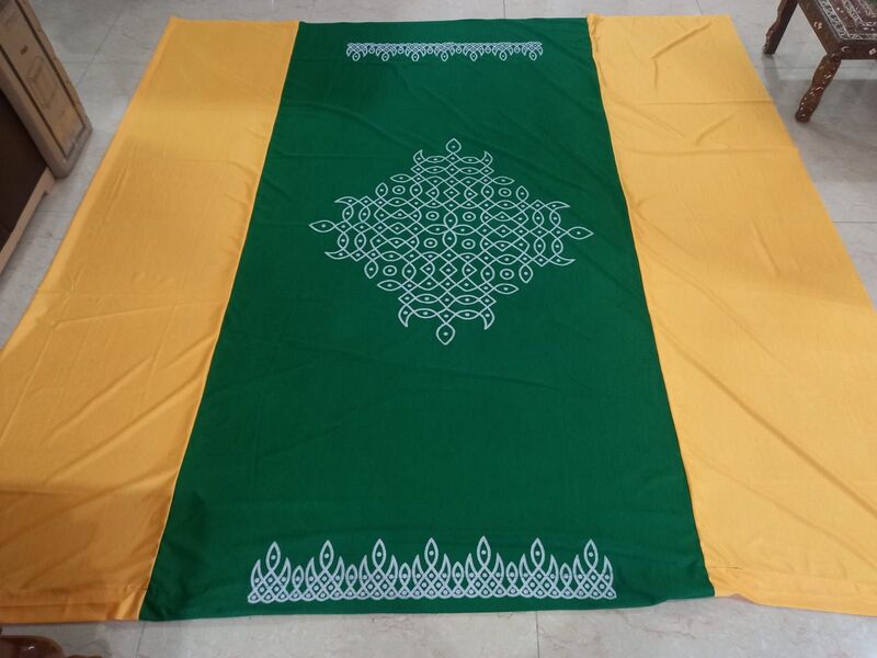 Sharu Space Crushed Satin Yellow and Green with Kollam Muggu