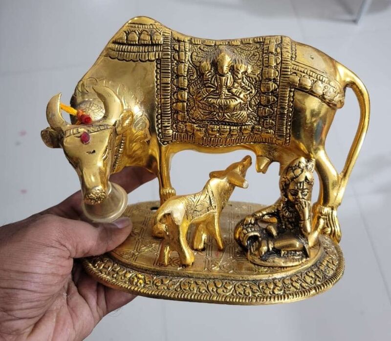 Sharu Space Gold Polished Big Cow and Calf with Bal Krishan Metal Idol
