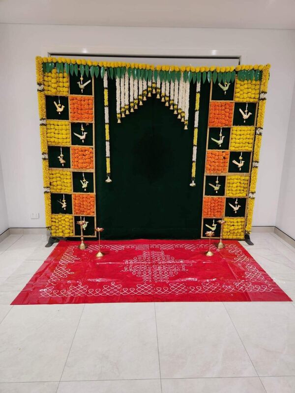Size: 8ftx9ft Set Includes Backdrop, all flower strings and palm leaf hangings, mango thoran Floor Mat of 8ftx4ft