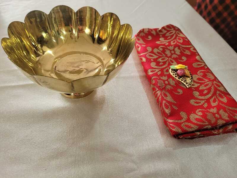 Combo includes brass bowl, banaras blouse piece and fancy haldi kumkum