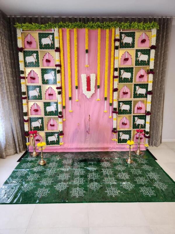 Size: 8ftx8ft Includes Backdrop and all Flower strings, Parrot Green Jumbo Thoran, Cow Prints, House Prints Floor Mat of 8ftx4ft