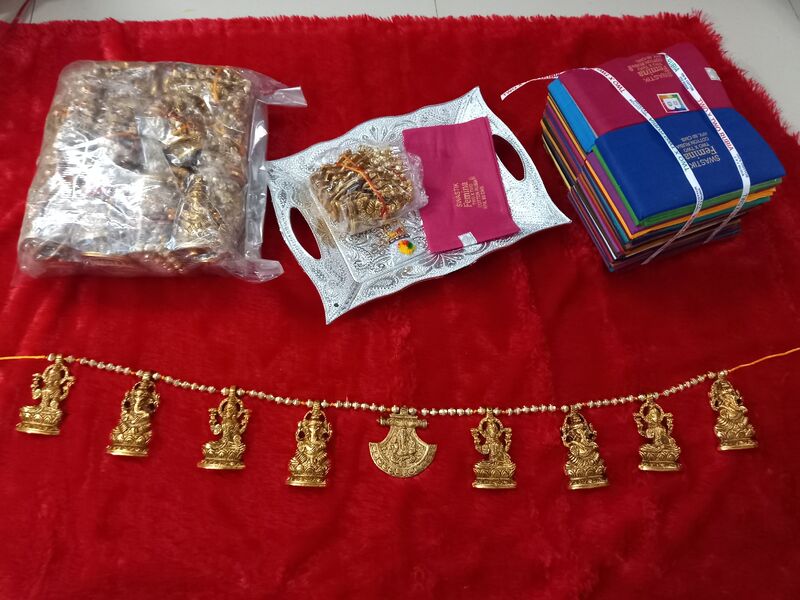 Gift Set Includes White Metal Thoran, Blouse piece, Fancy Paspu Kumkum & Fibre Tray